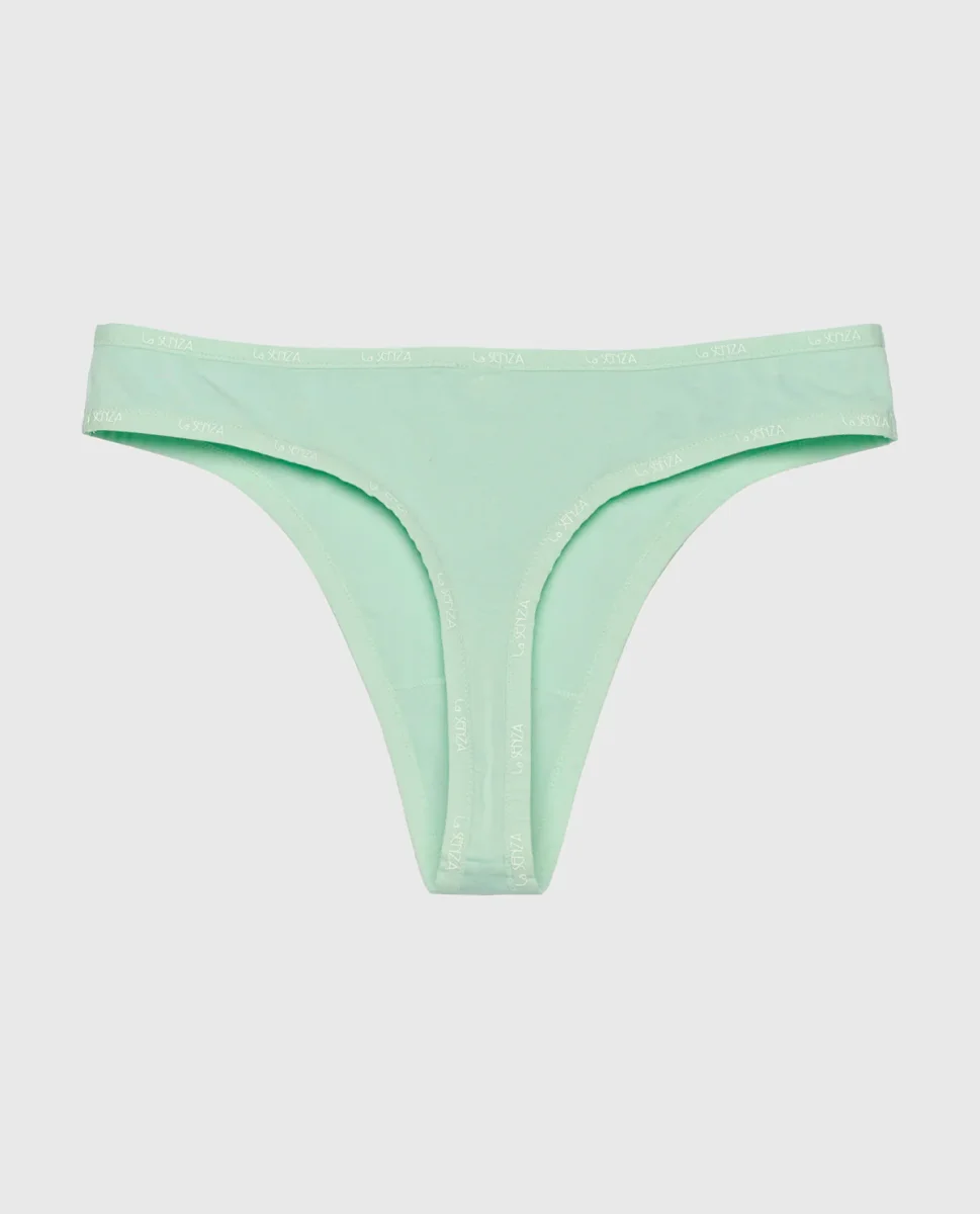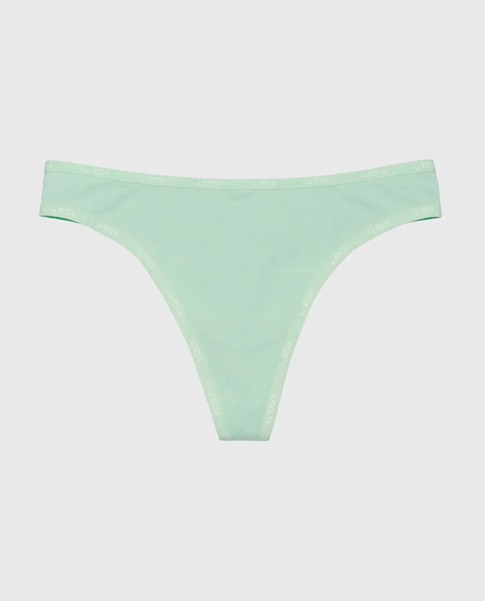 A bold take on minimalism—this Mist Green Thong Panty with Logo Trim features soft stretch fabric and signature logo detailing for an effortlessly cool look.