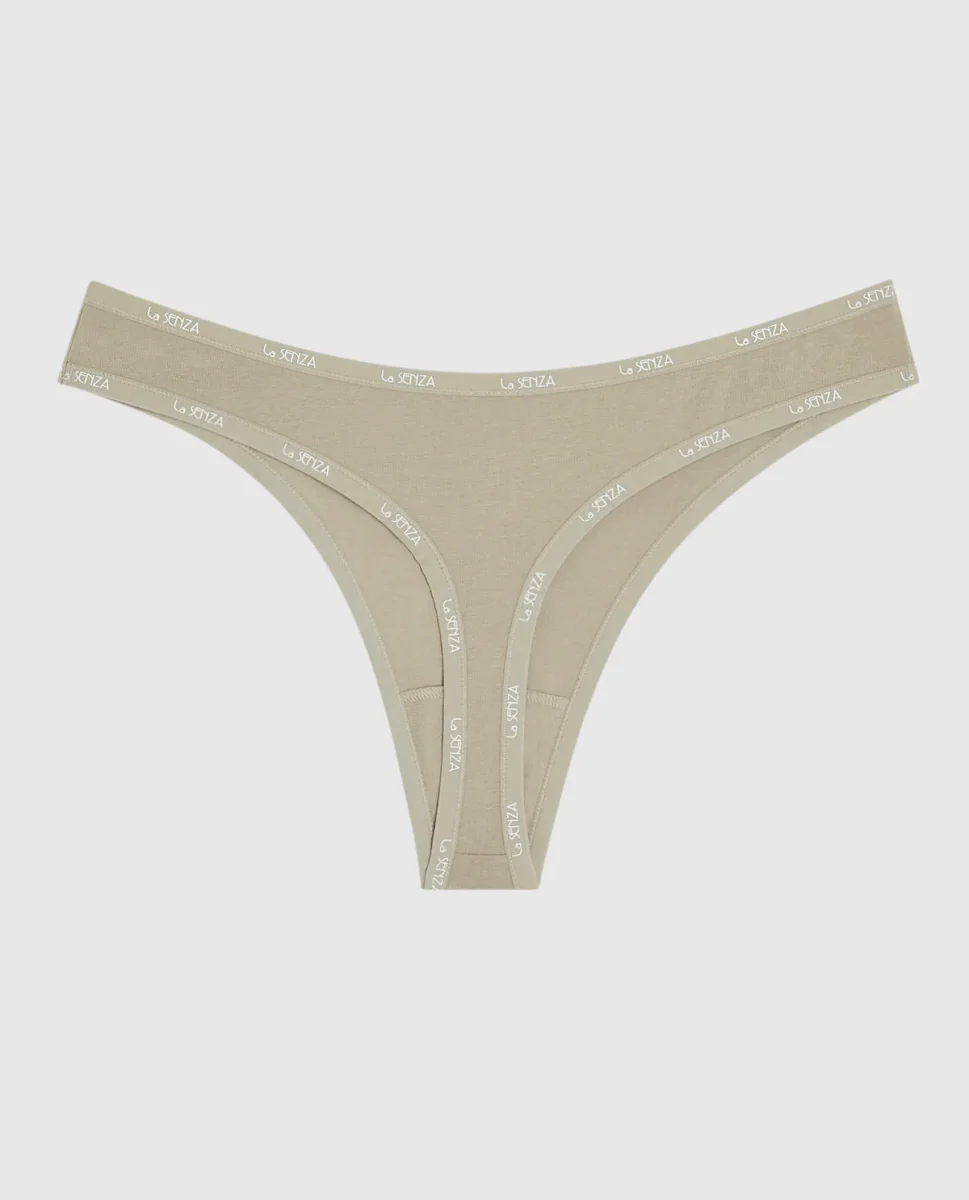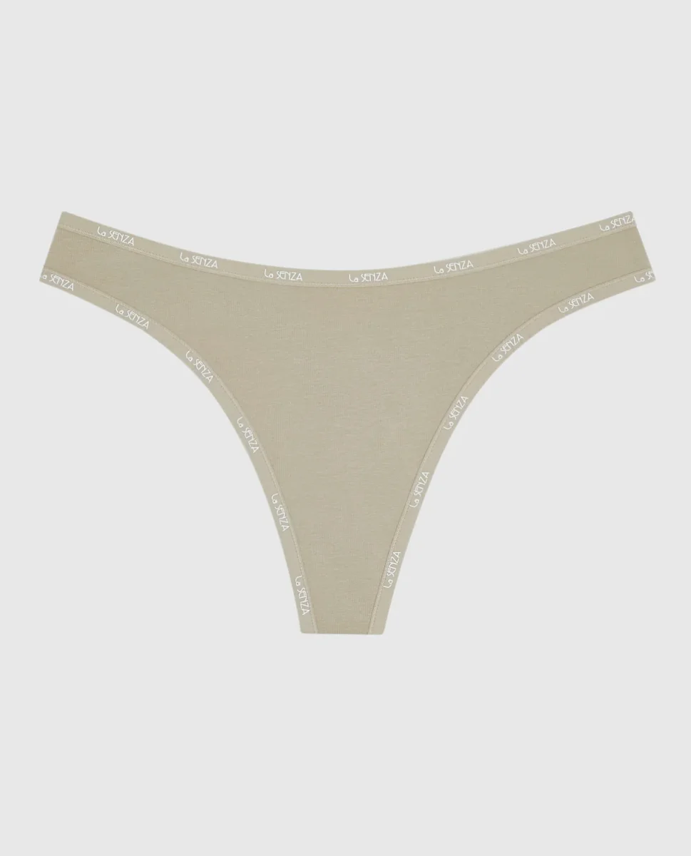 A bold take on minimalism—this Stone Grey Thong Panty with Logo Trim features soft stretch fabric and signature logo detailing for an effortlessly cool look.