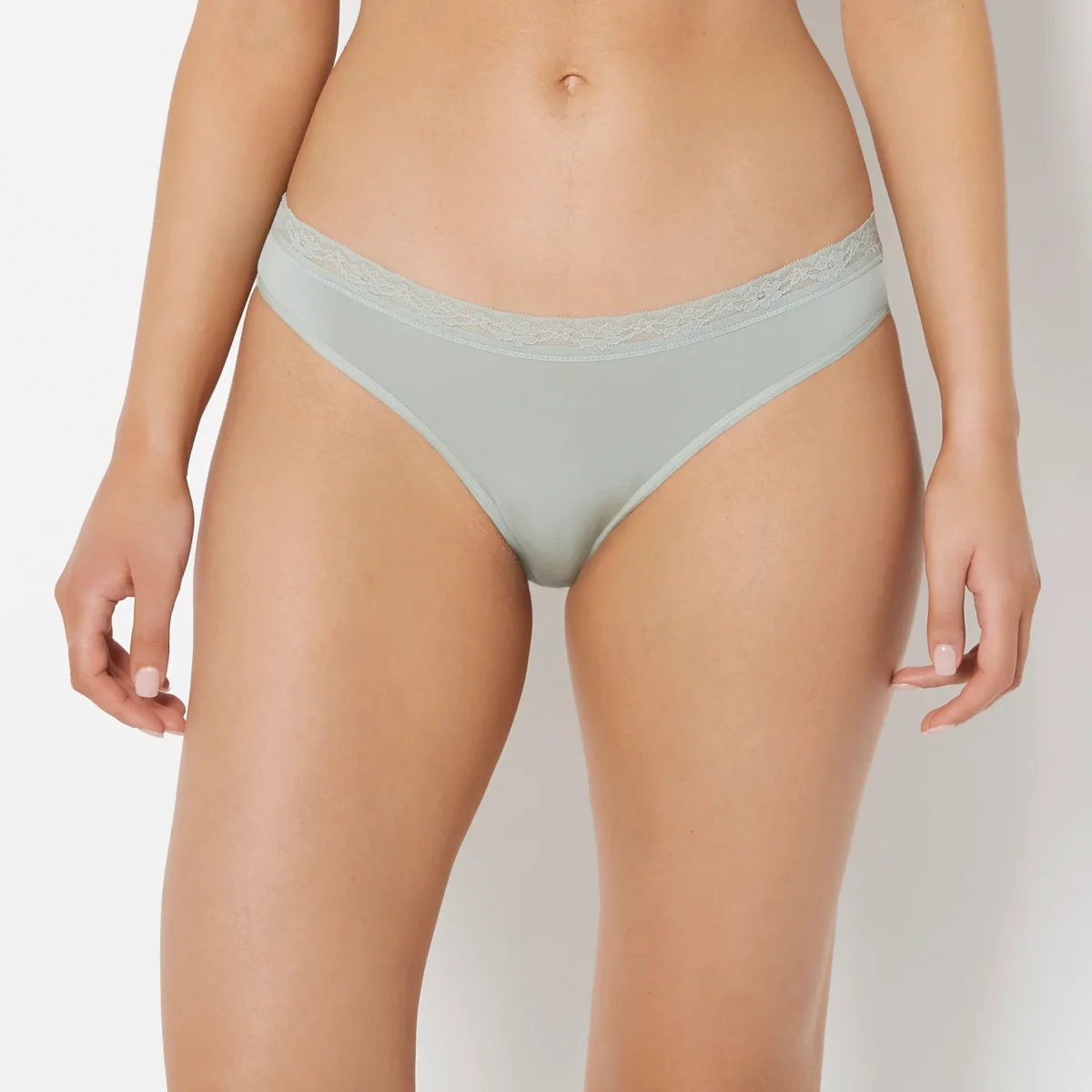 Discover serene comfort in this ultrasoft modal bikini panty, showcasing elegant lace trim in a refreshing iceberg green. The silky modal fabric glides smoothly against your skin, offering breathable wear for all-day confidence. A fresh seasonal essential that brings understated sophistication to your lingerie collection. Modal 92% MODAL, 8% ELASTANE