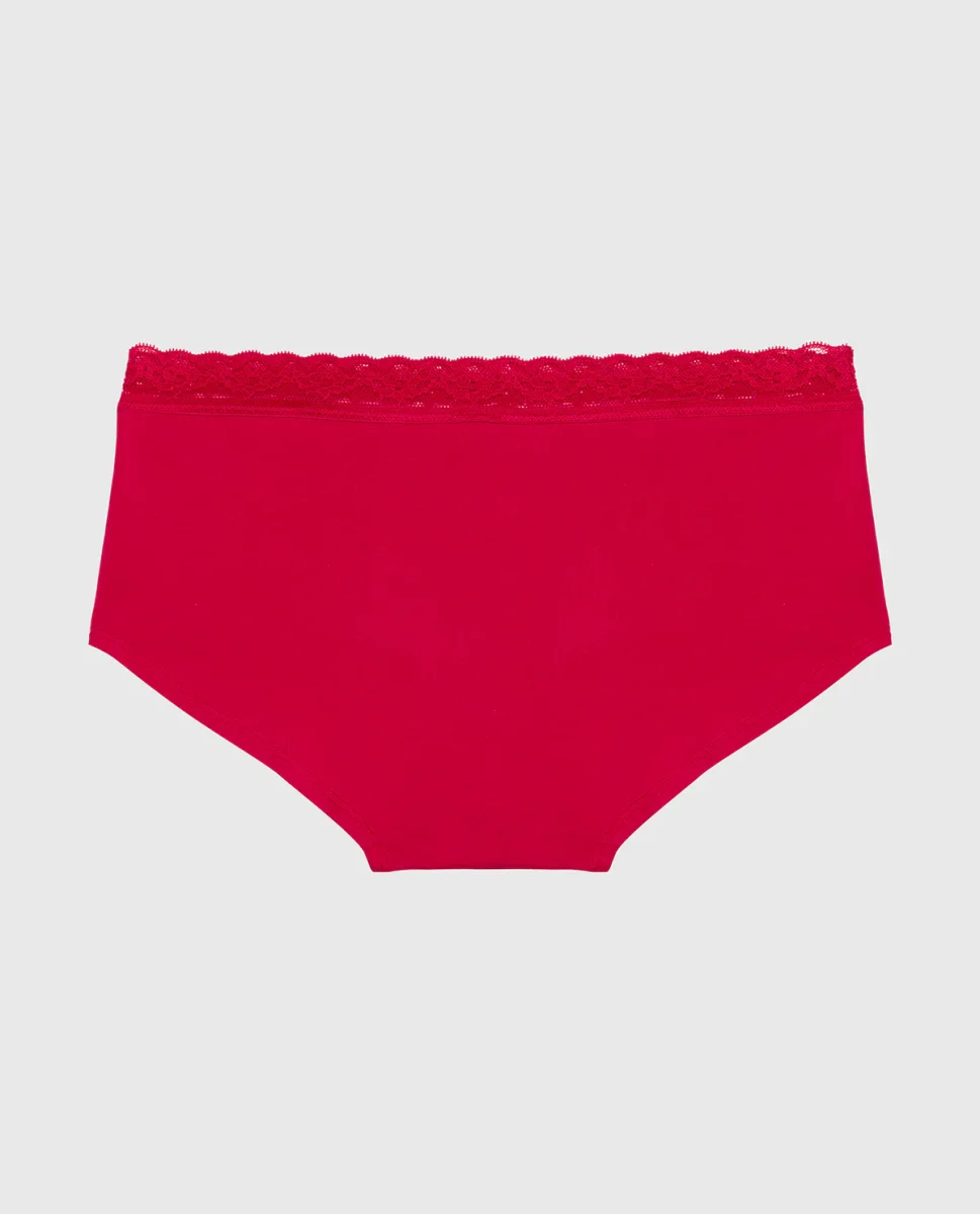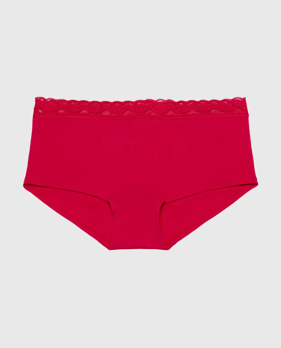 Ultrasoft Modal Boyshort Panty with Lace Trim in Crimson, discover effortless comfort in this beautiful hipster panty, rendered in a delicate Sweet Dream shade. The refined lace trim detailing adds a feminine touch while the thoughtful cut ensures a smooth, comfortable fit throughout your day.