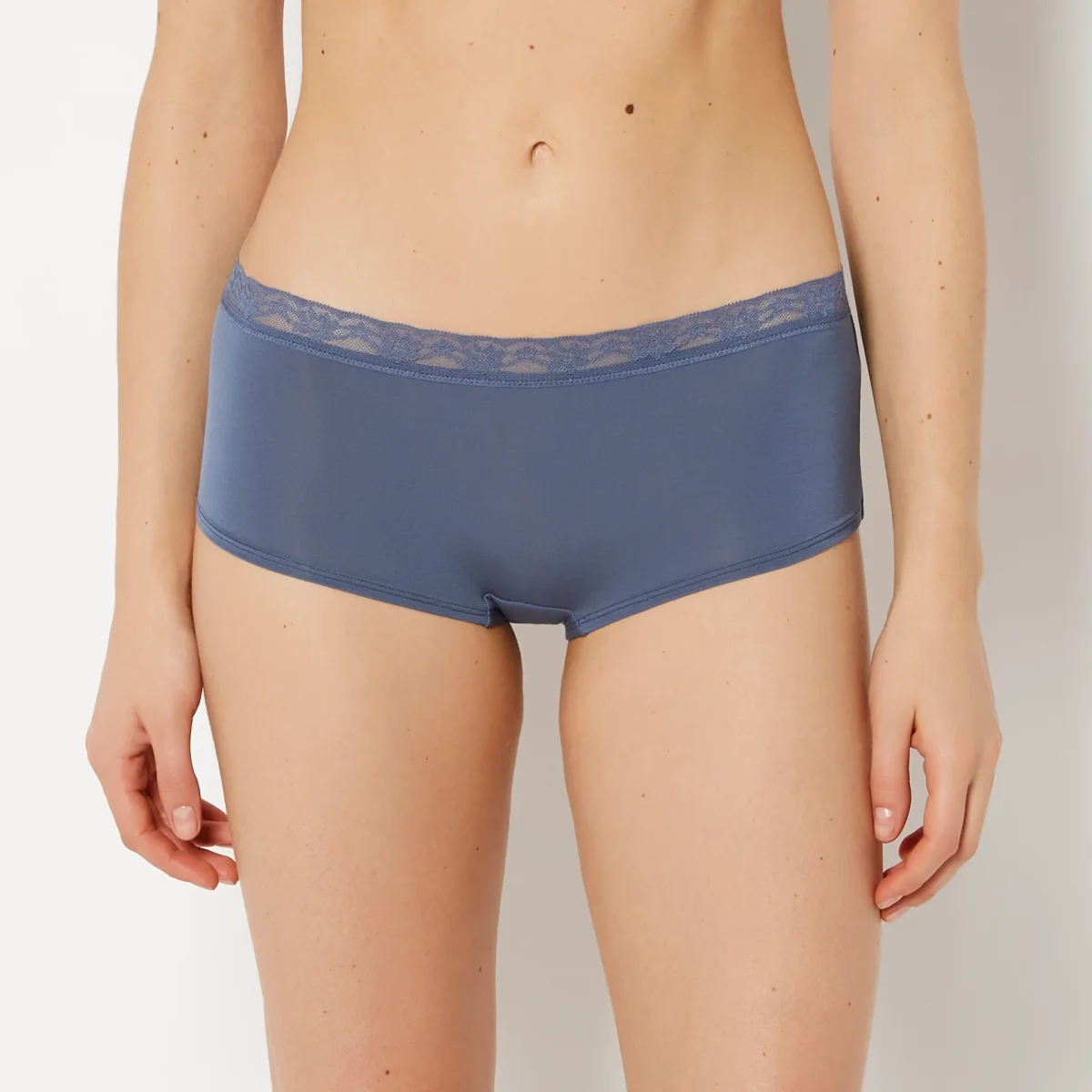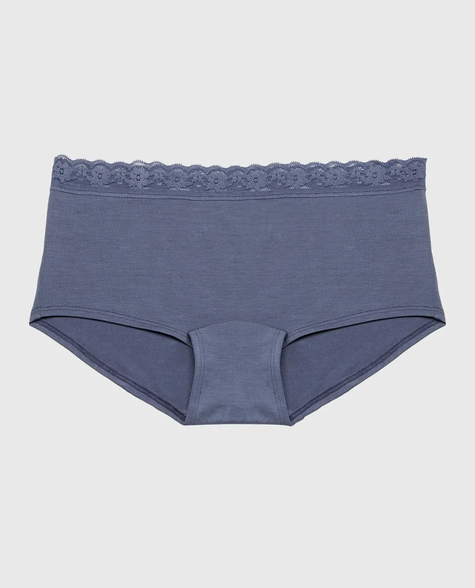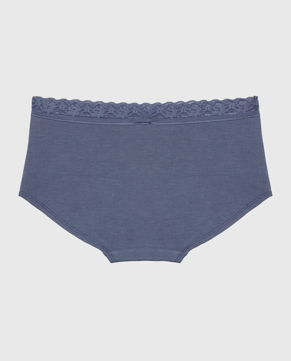 Experience ultimate comfort in this ultrasoft modal boyshort panty, featuring elegant lace trim in timeless vintage indigo. The smooth modal fabric offers a secure, supportive fit that moves with you, while the delicate lace accents add feminine sophistication. A reliable essential that combines all-day comfort with understated style.