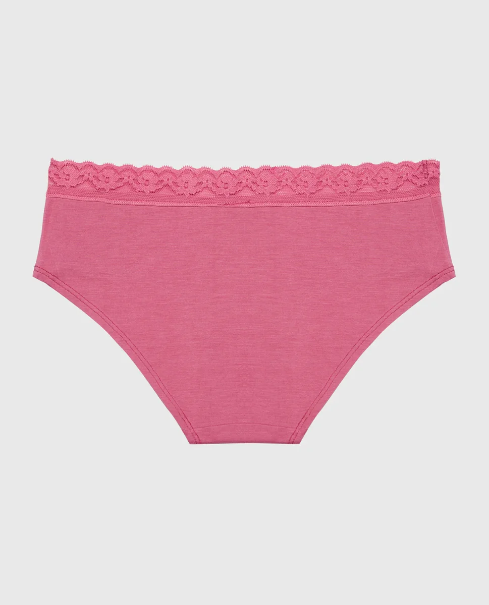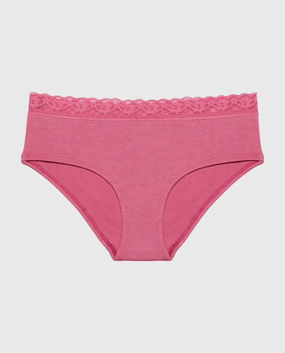 Make a statement in this ultrasoft modal hipster panty, featuring elegant lace trim in a captivating red violet. The silky modal fabric drapes beautifully while maintaining breathable comfort, and the refined lace detailing adds a touch of allure. An elevated essential that brings confidence and sophistication to your everyday wear. 92% MODAL, 8% ELASTANE Modal