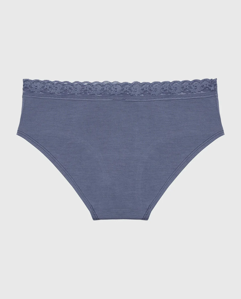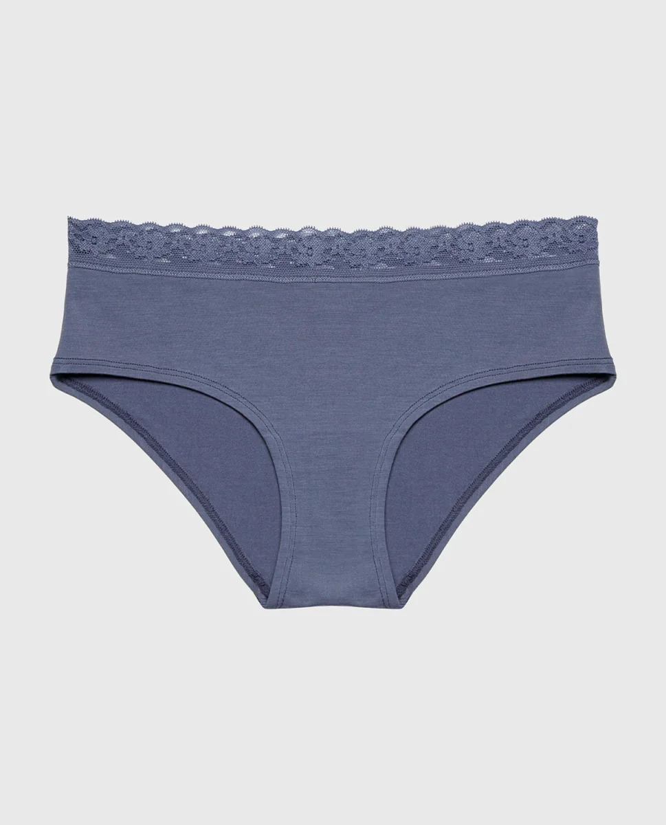 Indulge in timeless comfort with this ultrasoft modal hipster panty, adorned with delicate lace trim in a sophisticated vintage indigo. The breathable modal fabric hugs your curves gently while maintaining its shape, and the refined lace accents bring an understated elegance. A versatile staple that effortlessly transitions from day to night.