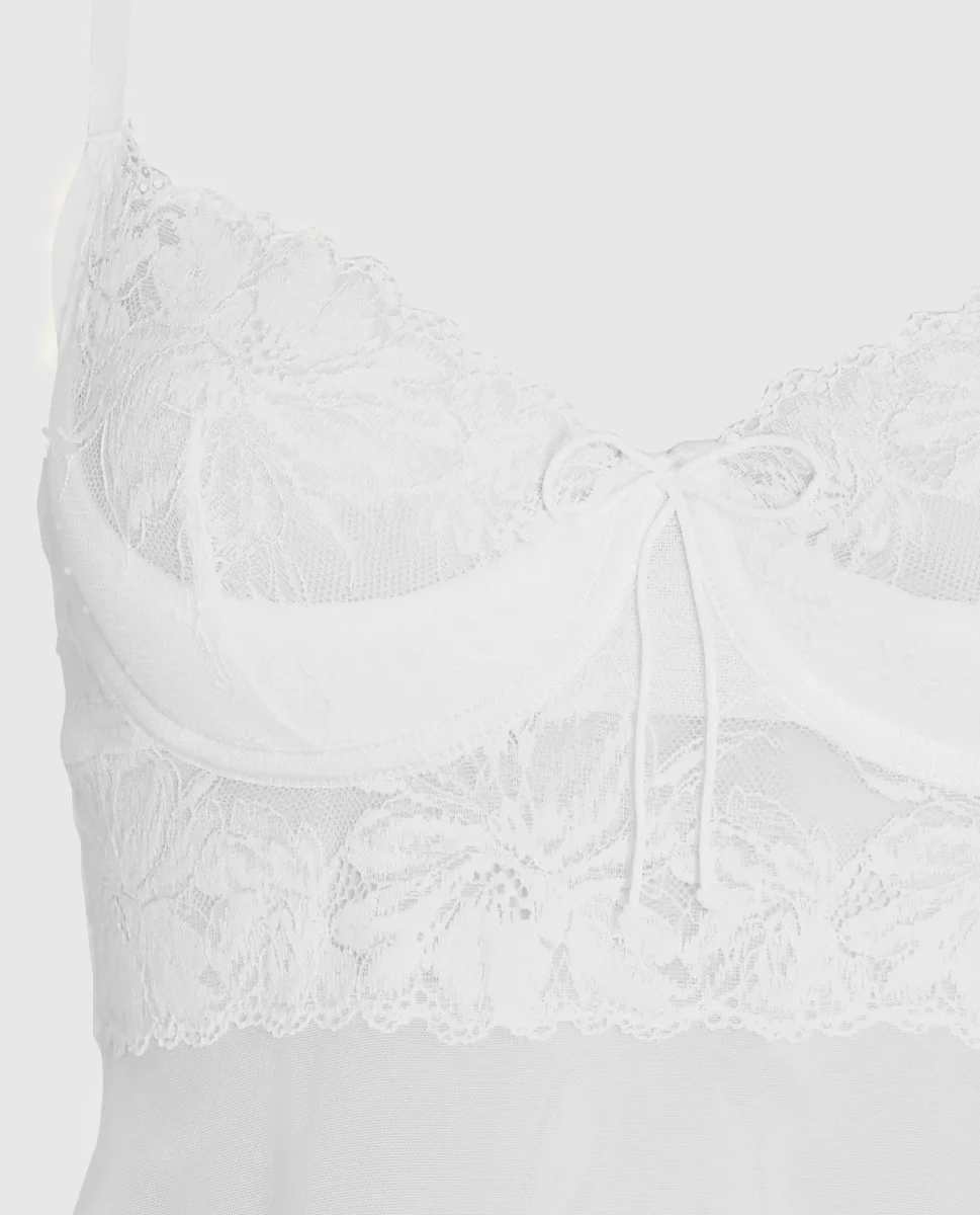 Flirty and Sweet! Embrace your confidence in our Ivory Balconette Babydoll with a Bow . Panty Included Unlined Lace Quarter Cups Tie-Up Detail Adjustable bra straps Imported polyamide, elastane.
