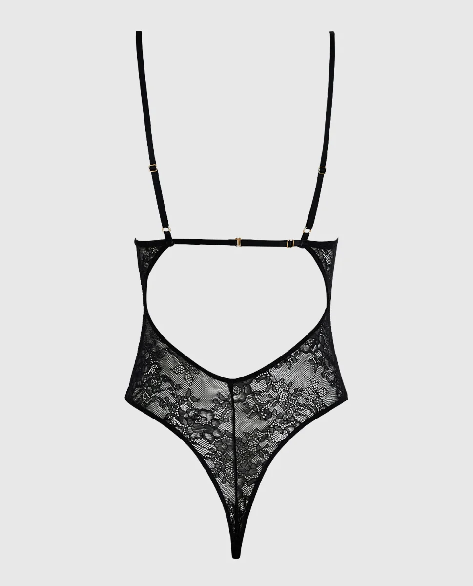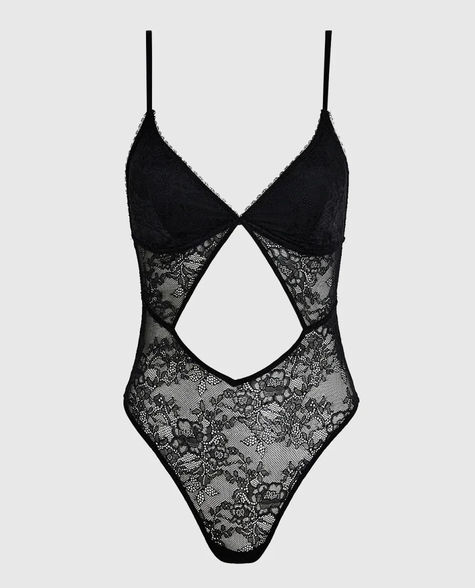 Dare to be bold with this Unlined Lace Bodysuit with Cutout in Black, where sophistication meets sultry charm. Crafted from delicate floral lace, this piece combines elegance with an edge, making it the ultimate statement in lingerie.