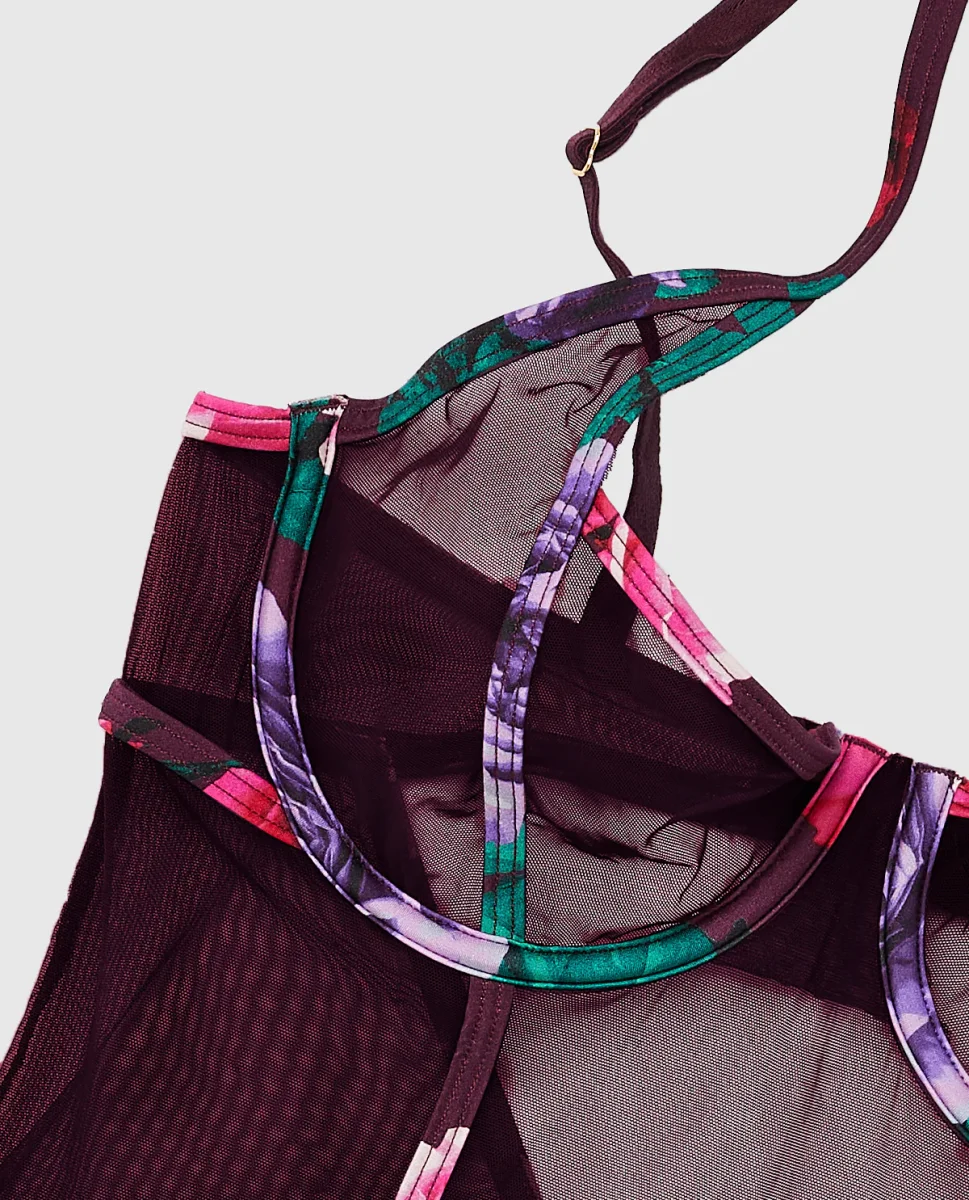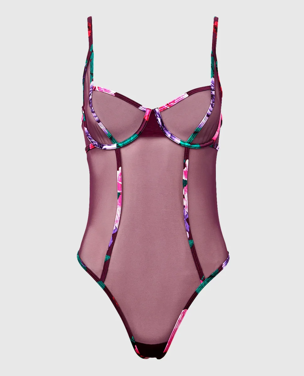 Wear for a romantic evening! This unlined bodysuit features our allover mesh, floral underwire and an open back.