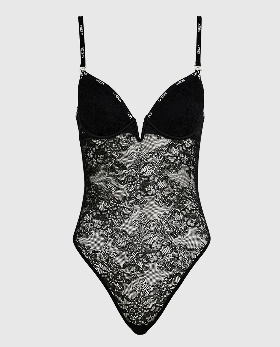 This bodysuit is designed with our newest lace detailed with a plunging neckline, complimented with a skinny logo band along the cups and a cut out back. Plunging neckline Lace body Adjustable bra straps Pulls on Skinny logo band along the cups Cut-out back Back clasp Imported polyamide, elastane