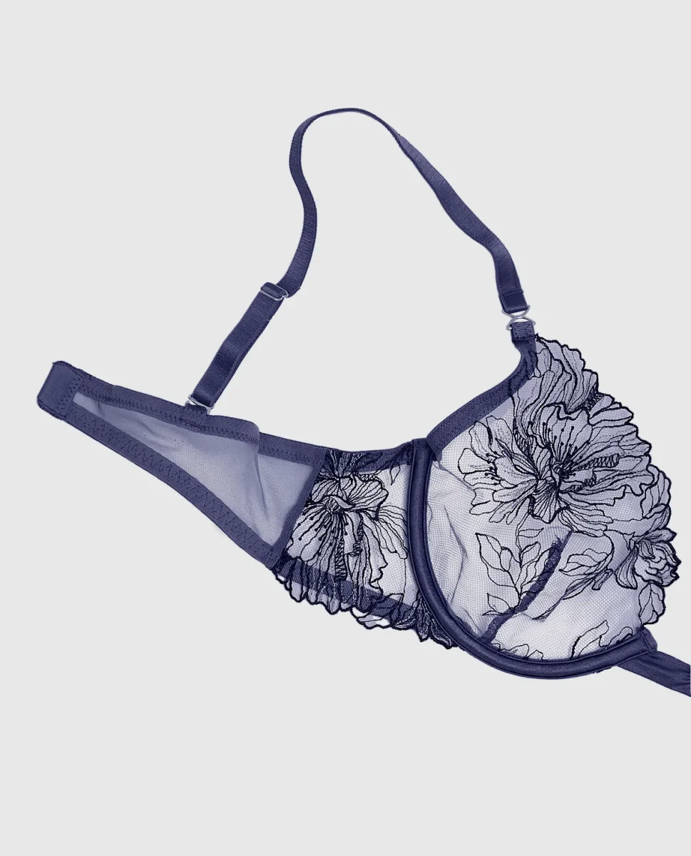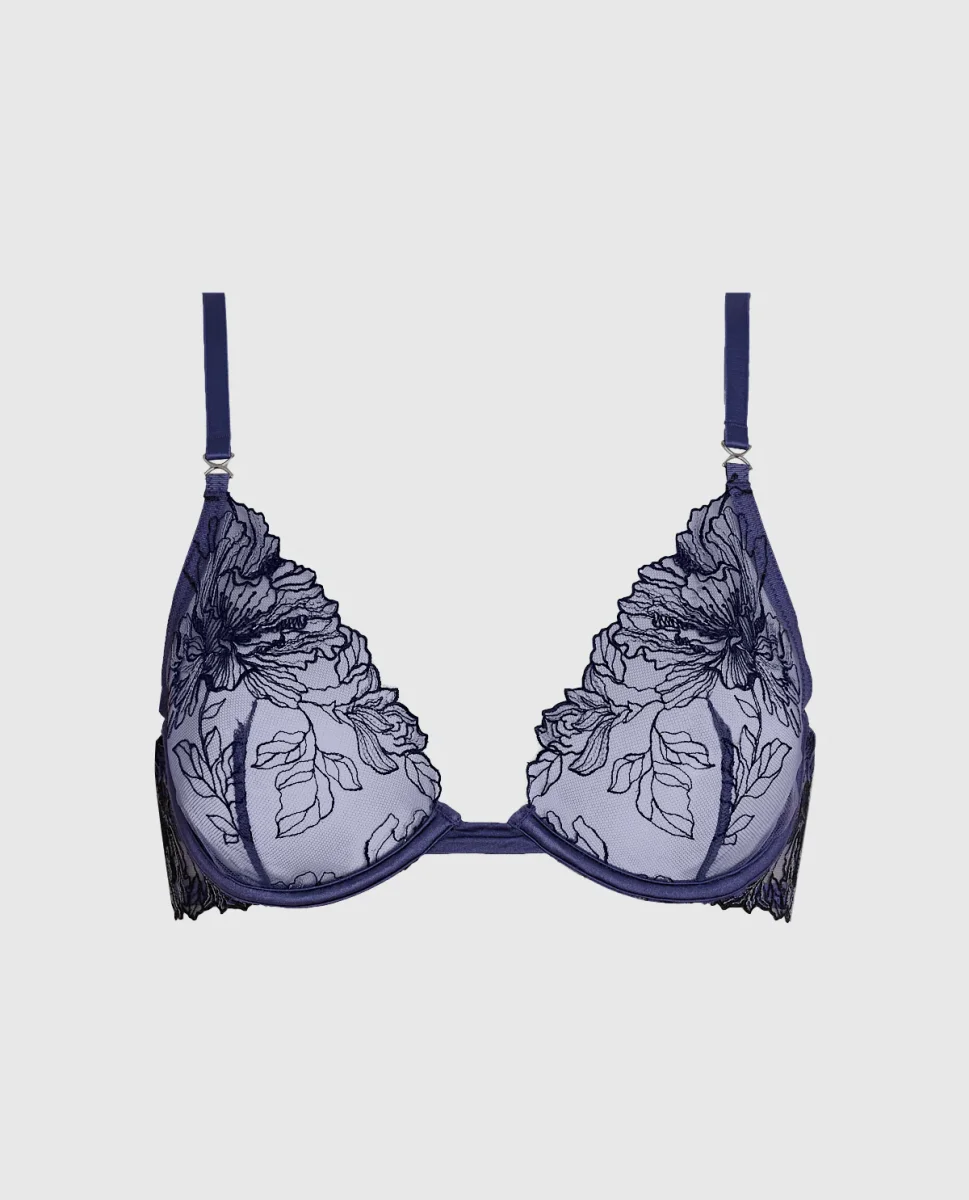One of our most luxurious bras of the season! This Dusk Blue Unlined Plunge Bra has stunning embroidered lace details throughout. Complete the look with its matching panty. Unlined Lace Cups Adjustable bra straps Back Closure Imported polyamide, elastane.