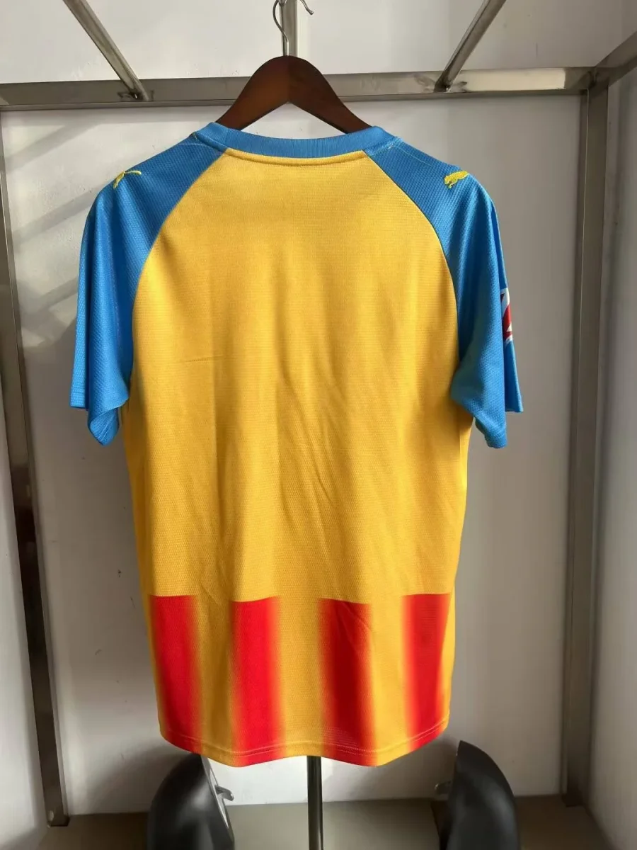 Ce maillot présente un jaune vibrant orné de bandes rouges verticales, symbolisant fièrement le drapeau valencien. Les manches bleues et les détails jaunes ajoutent une touche élégante et unique. Fabriqué dans un tissu technique respirant, il offre un confort optimal lors de l’effort.