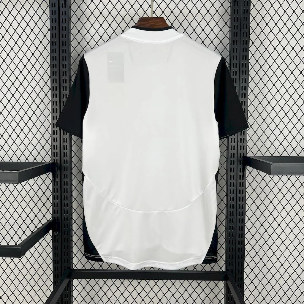 Ce maillot arbore le légendaire coloris blanc du Valencia CF, accompagné de détails noirs et orange élégants. Conçu en polyester respirant, il garantit un confort optimal tout en restant fidèle à l’authenticité du modèle porté par les joueurs lors de la finale victorieuse contre l’Olympique de Marseille.