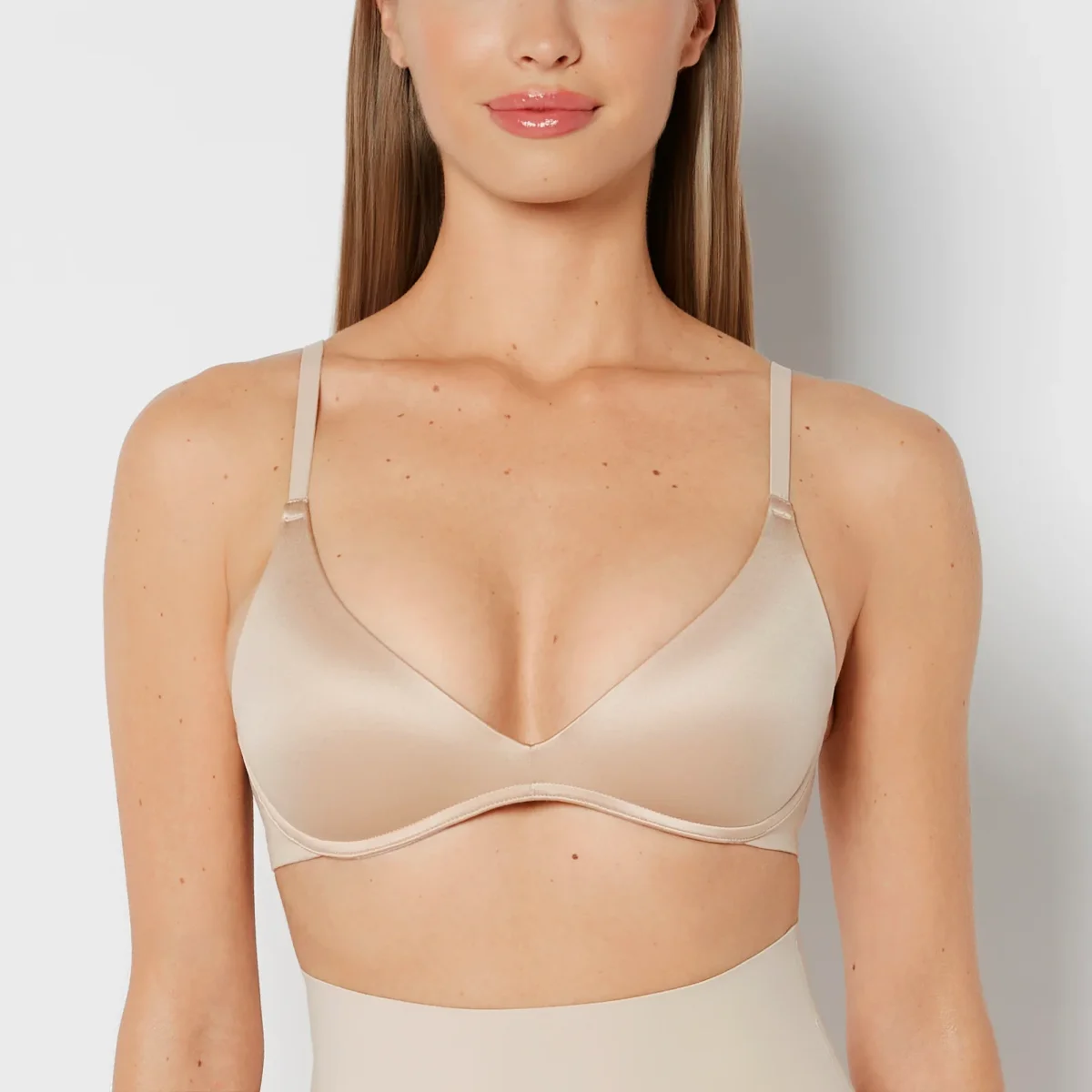 Introducing our new wireless bra with super soft brushed microfiber and a light cushioned padding that provides a subtle lift. Light push up cushioned padding for a subtle lift Wireless Demi cup Super soft brushed microfiber Open neckline Wide smoothing wing Back closure Imported polyester, elastane
